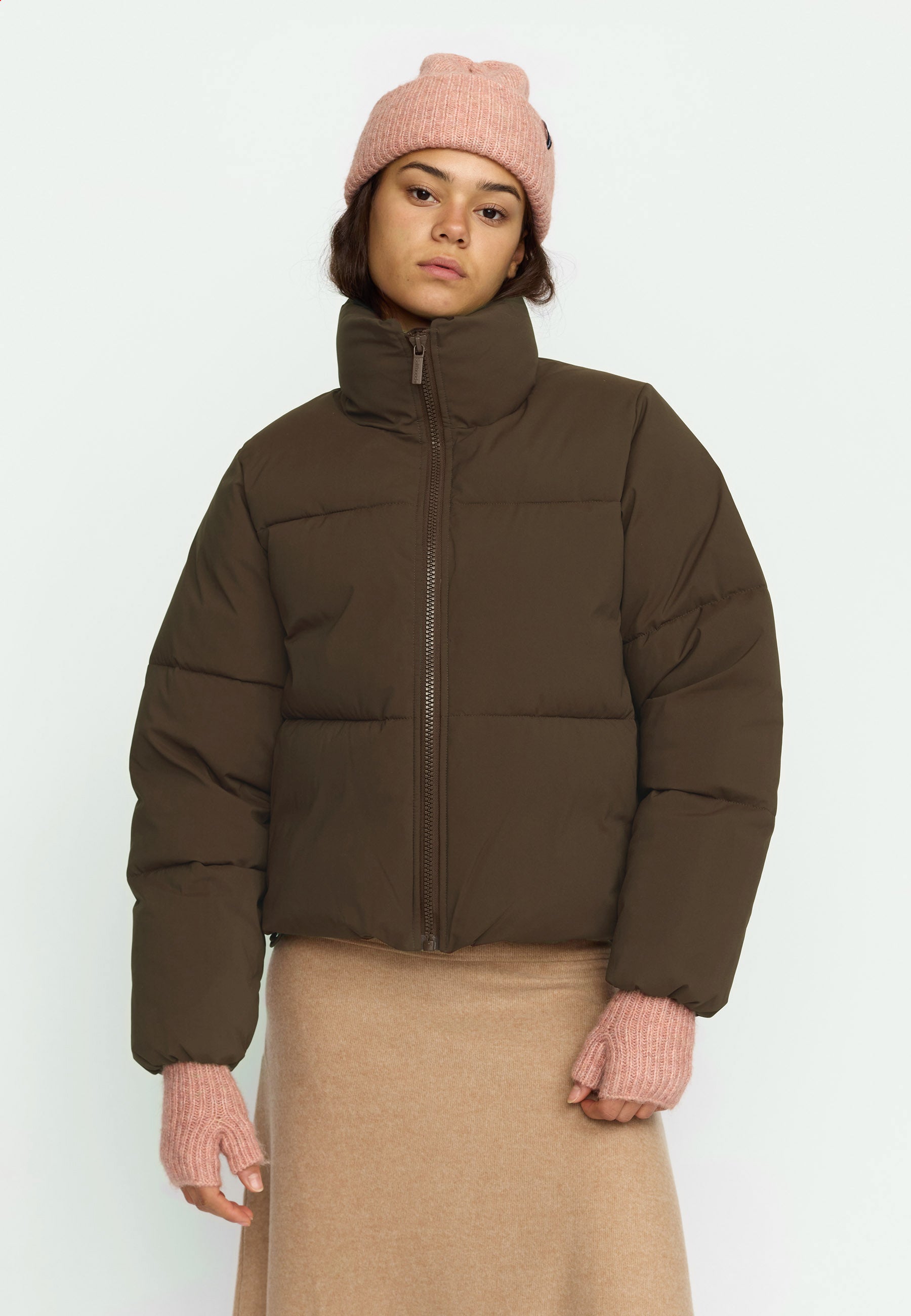 Puffer jacket in a subtle cropped design, made of a thin stretchable recycled polyester fabric. The puffer jacket is made with a bold tone in tone Vislon zipper, a standup collar, and an adjustable bottom hemline. The side-pockets with hidden zippers are lined with warm fleece lining for extra comfort. The water-repellent Teflon EcoElite coating is environmentally friendly, free of harmful fluorocarbon. The warm and highly compressible insulation is a DuPont Sorona Padding, a fiber partially made with renewable plant-based ingredients and produced with particular attention towards the environment
