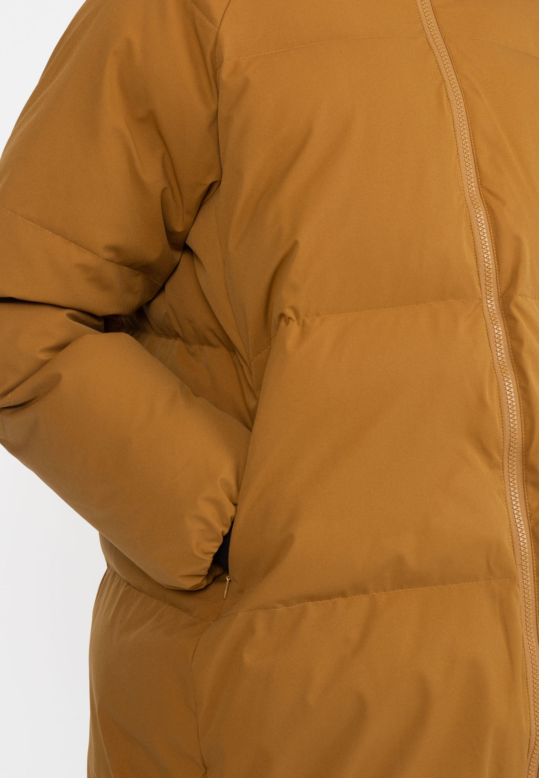 Mid-cut hooded puffer jacket in an oversized design, made of a thin stretchable recycled polyester fabric. The puffer jacket is made with raglan sleeves, a bold tone in tone Vislon zipper and an adjustable bottom hemline. The side-pockets with hidden zippers are lined with warm fleece lining for extra comfort. The water-repellent Teflon EcoElite coating is environmentally friendly, free of harmful fluorocarbon. The warm and highly compressible insulation is a DuPont Sorona Padding, a fiber partially made with renewable plant-based ingredients and produced with particular attention towards the environment