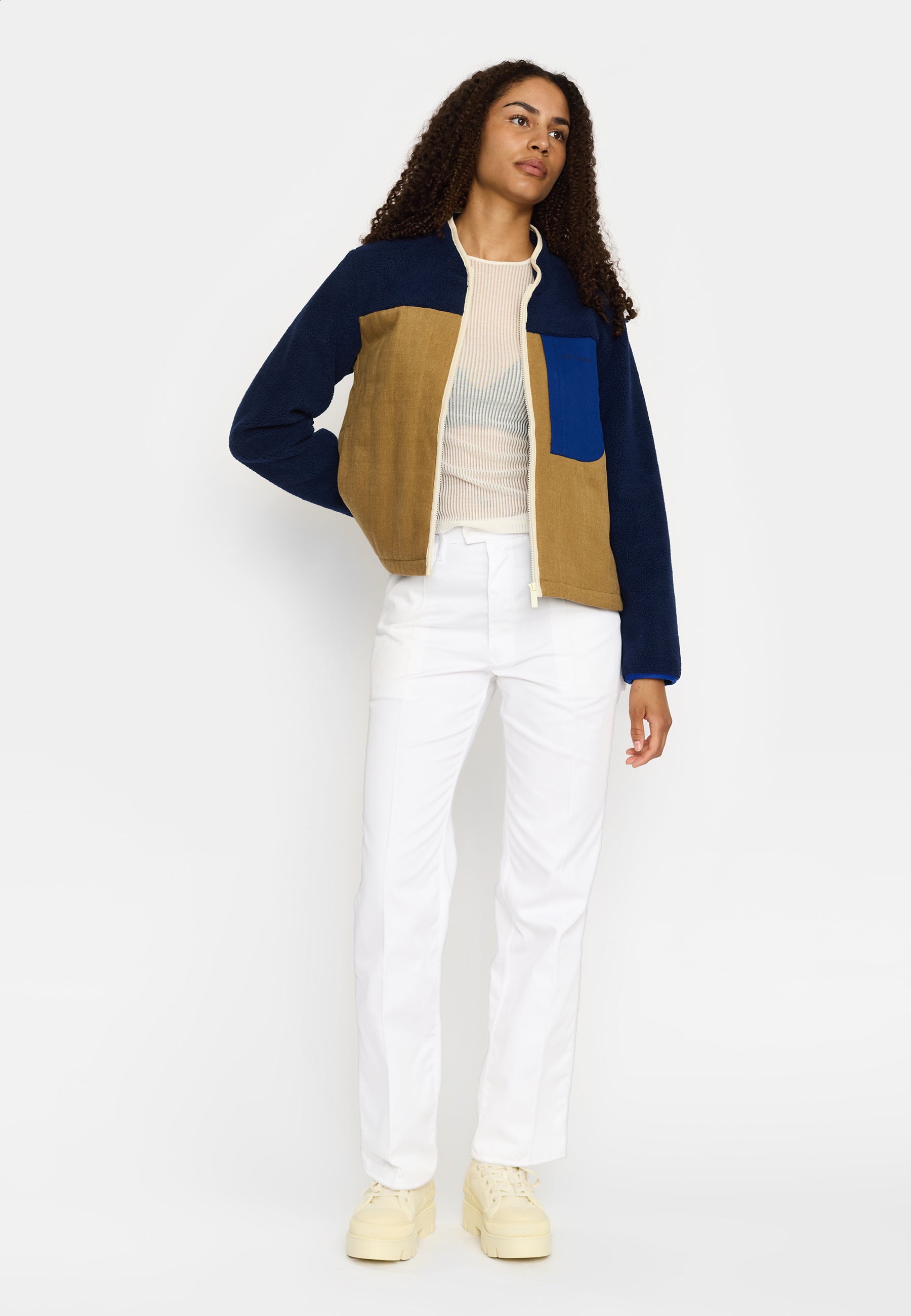 This teddy-quilt block-color jacket, in a subtle oversized fit, is designed in a mix of soft cotton twill and teddy fabric. The top body and the sleeves are teddy fabric, and the bottom body is vertically quilted cotton twill, with a 60 GMS Recycled Thinsulate™ insulation, which is made of 78% recycled fiber. The chest pocket with rounded edge is made in a contrast color, and the placket and collar are finished with a cotton binding. The jacket has a zipped front-placket-closure and will keep you warm on a chilly spring day