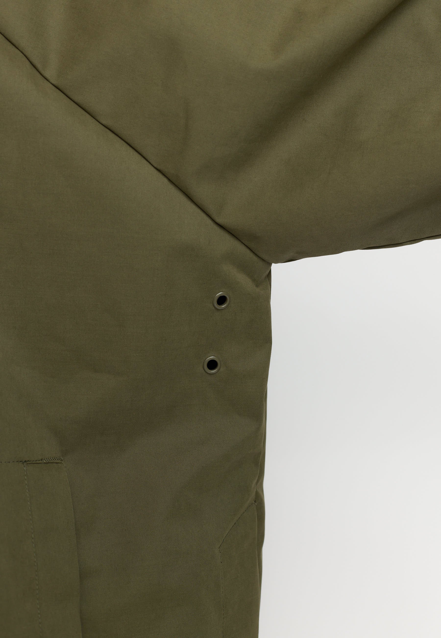 Hooded poncho made of recycled polyester fabric with a soft, peached surface. The oversize, lightweight design can be layered over a sweater or a teddy for extra protection against the elements or just as it is on a rainy spring day. The poncho is designed with welt-pockets, and the pocket-bags are shaped as a perfect half-moon. The sleeves are made in a wide design, with a visible elastic drawstring and string-stopper, which gathers the sleeve-end into characteristic puff-sleeves. To guarantee that this garment is free from any harmful fluorocarbon, it is coated with environmentally friendly and water-repellent Teflon EcoElite coating