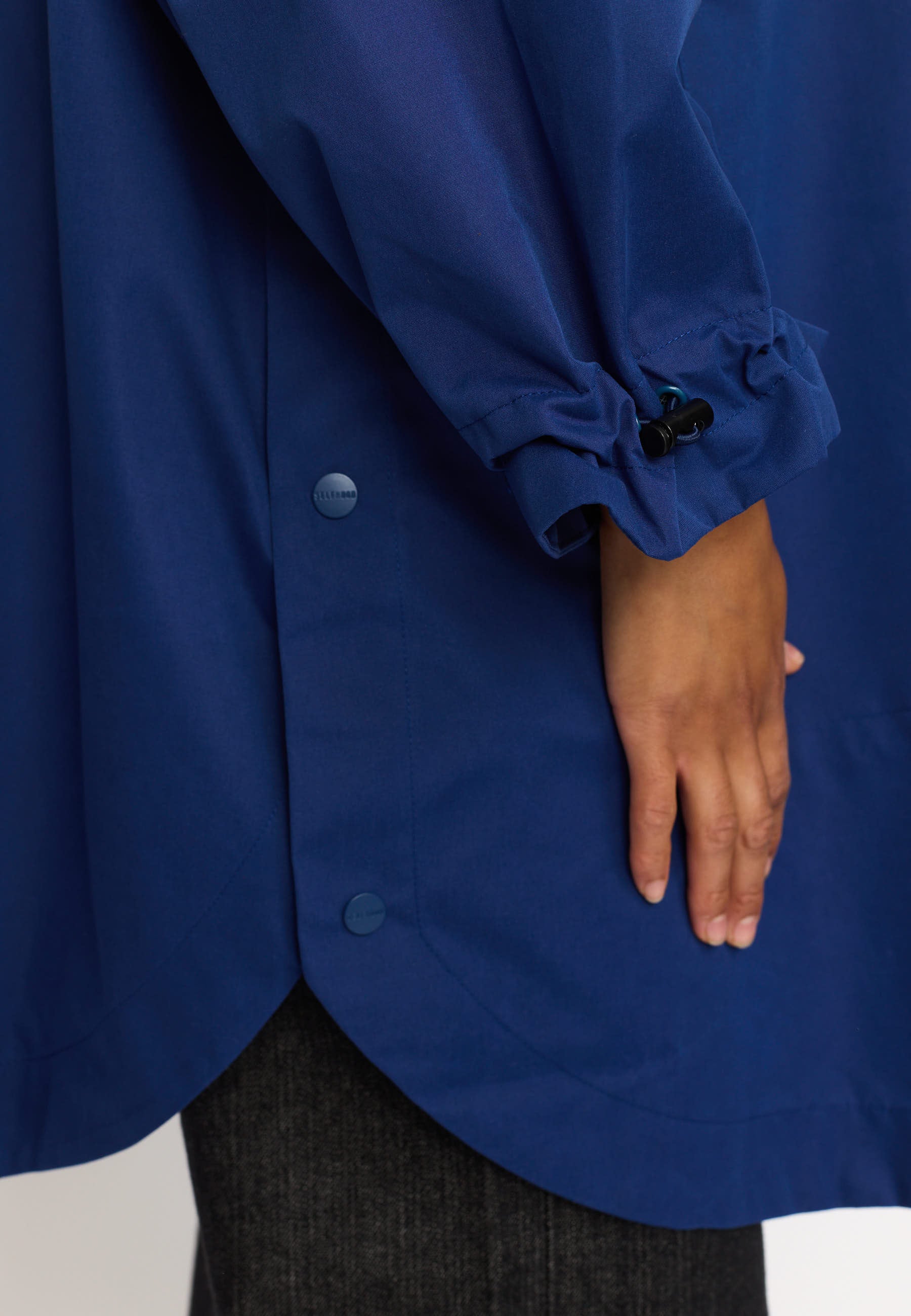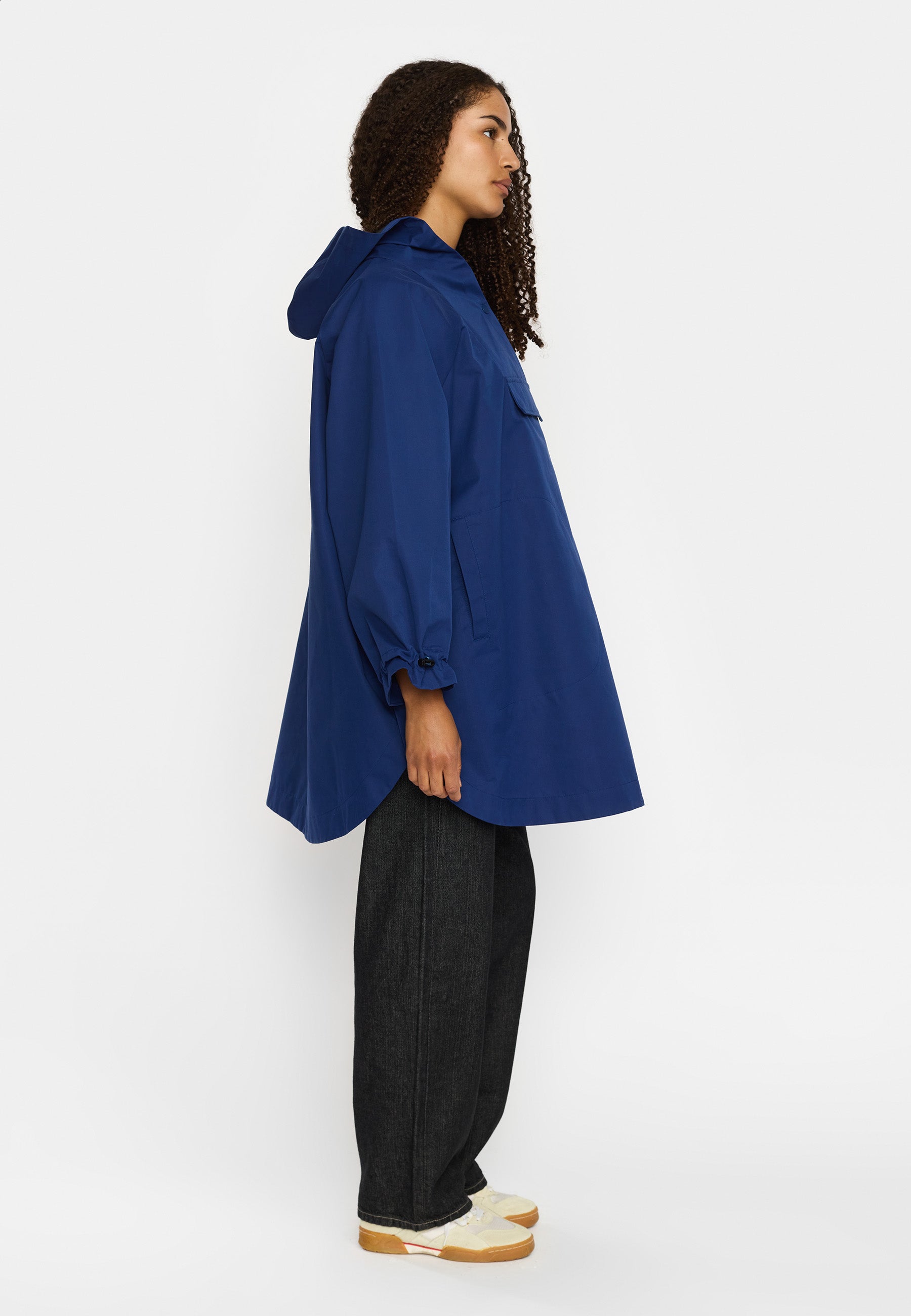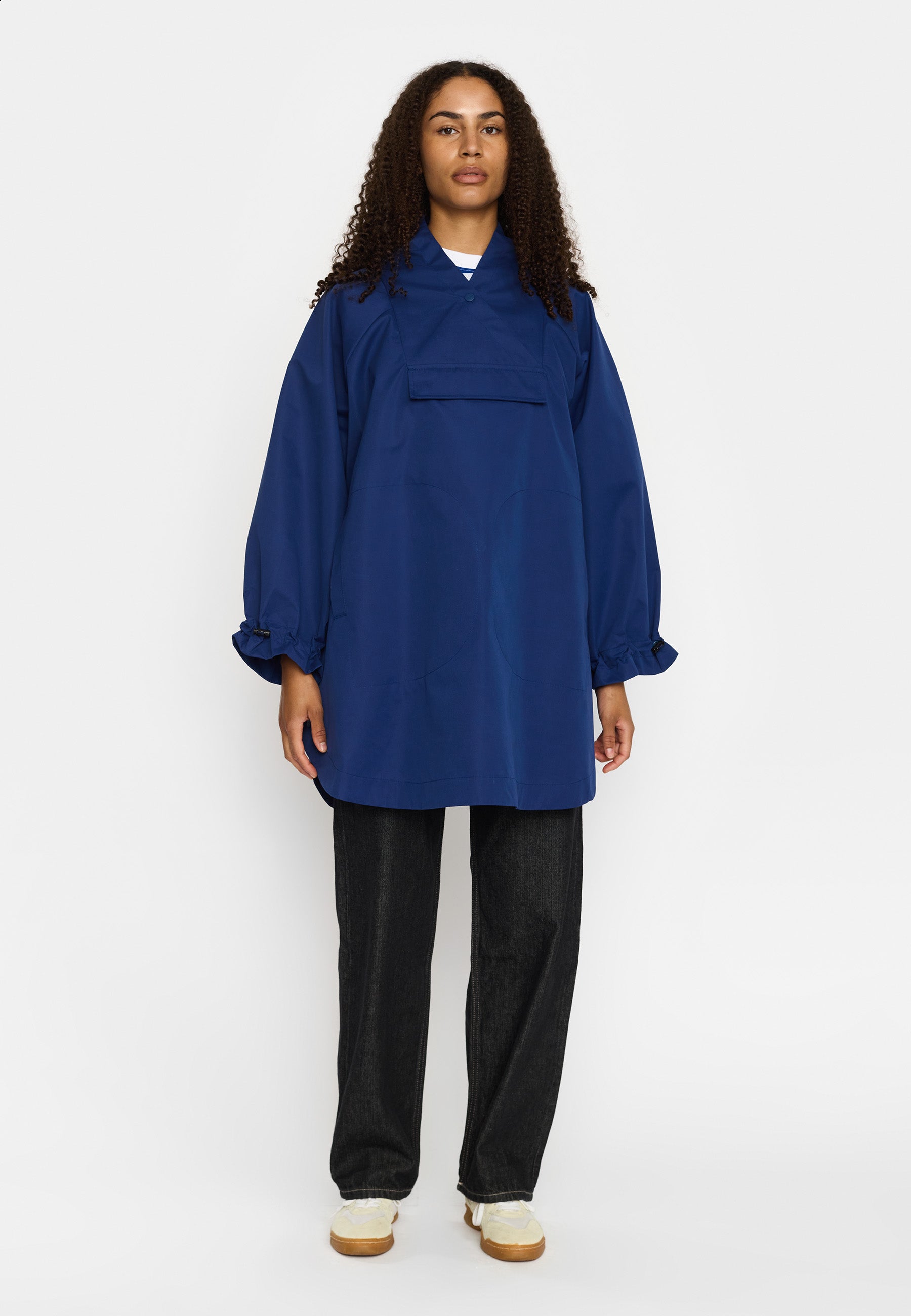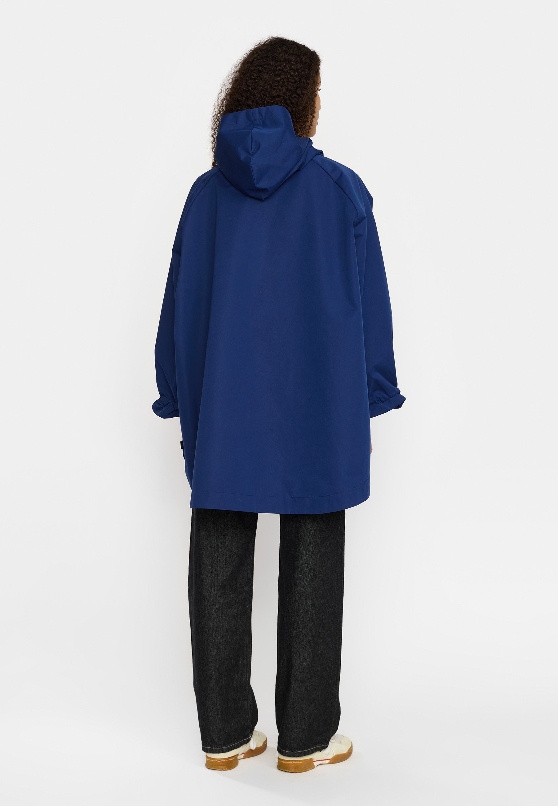 Hooded poncho made of recycled polyester fabric with a soft, peached surface. The oversize, lightweight design can be layered over a sweater or a teddy for extra protection against the elements or just as it is on a rainy spring day. The poncho is designed with welt-pockets, and the pocket-bags are shaped as a perfect half-moon. The sleeves are made in a wide design, with a visible elastic drawstring and string-stopper, which gathers the sleeve-end into characteristic puff-sleeves. To guarantee that this garment is free from any harmful fluorocarbon, it is coated with environmentally friendly and water-repellent Teflon EcoElite coating