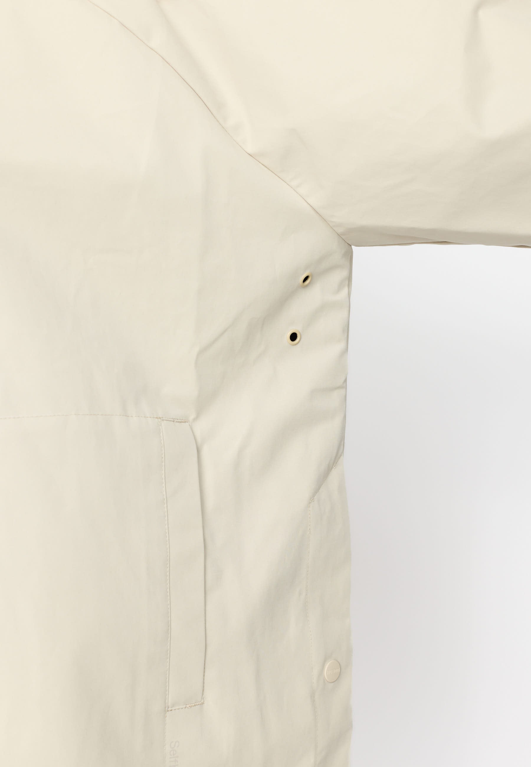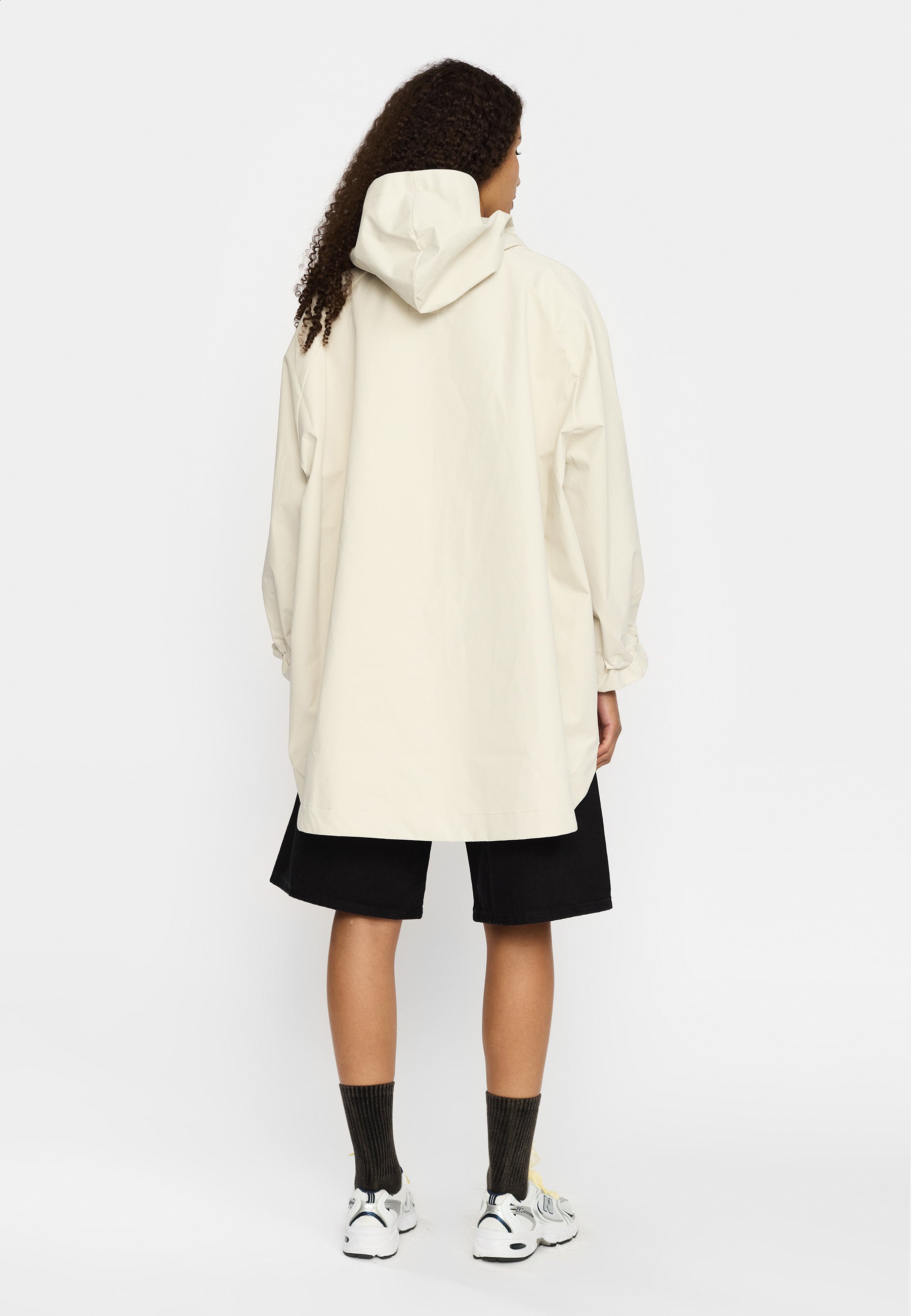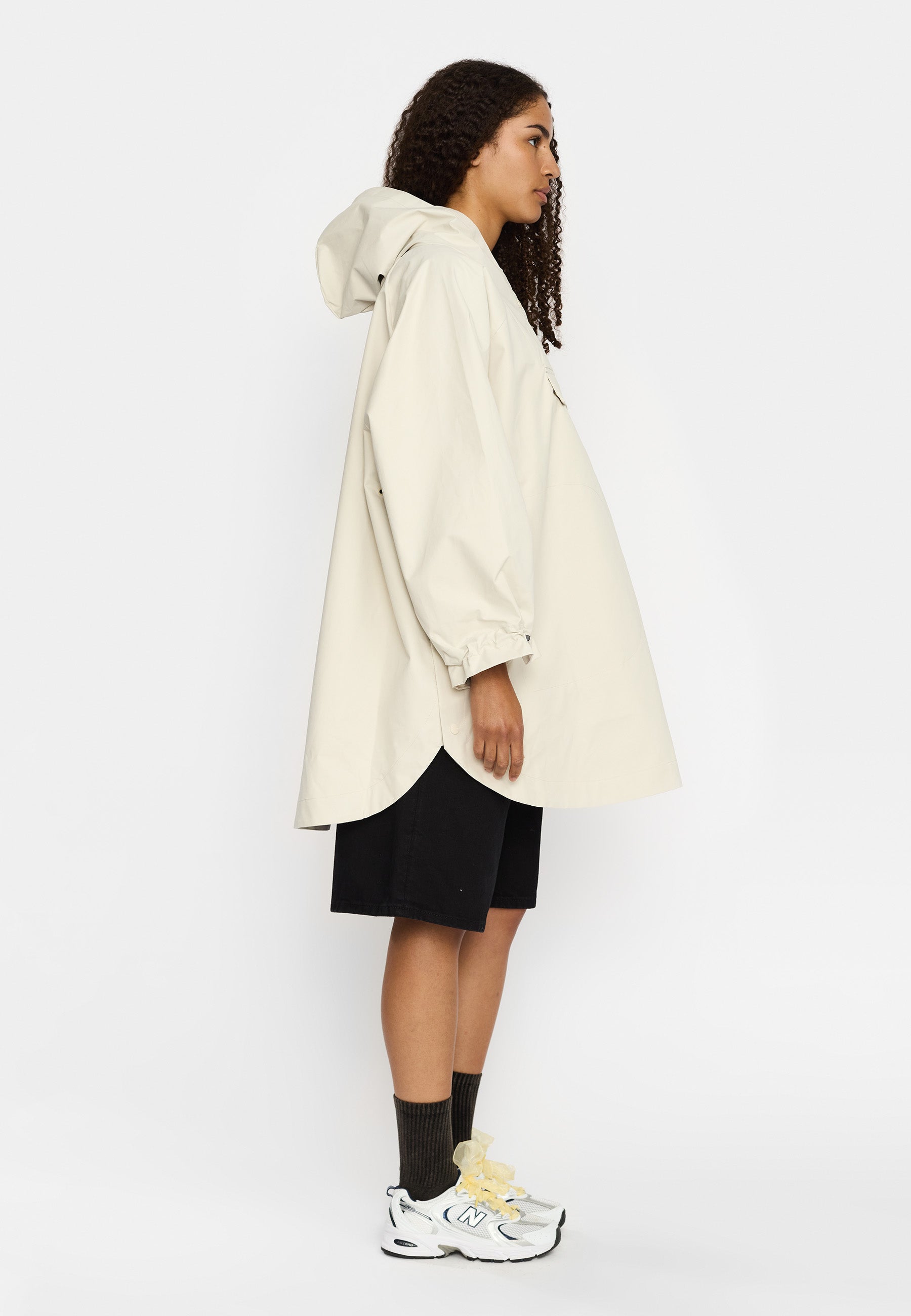 Hooded poncho made of recycled polyester fabric with a soft, peached surface. The oversize, lightweight design can be layered over a sweater or a teddy for extra protection against the elements or just as it is on a rainy spring day. The poncho is designed with welt-pockets, and the pocket-bags are shaped as a perfect half-moon. The sleeves are made in a wide design, with a visible elastic drawstring and string-stopper, which gathers the sleeve-end into characteristic puff-sleeves. To guarantee that this garment is free from any harmful fluorocarbon, it is coated with environmentally friendly and water-repellent Teflon EcoElite coating