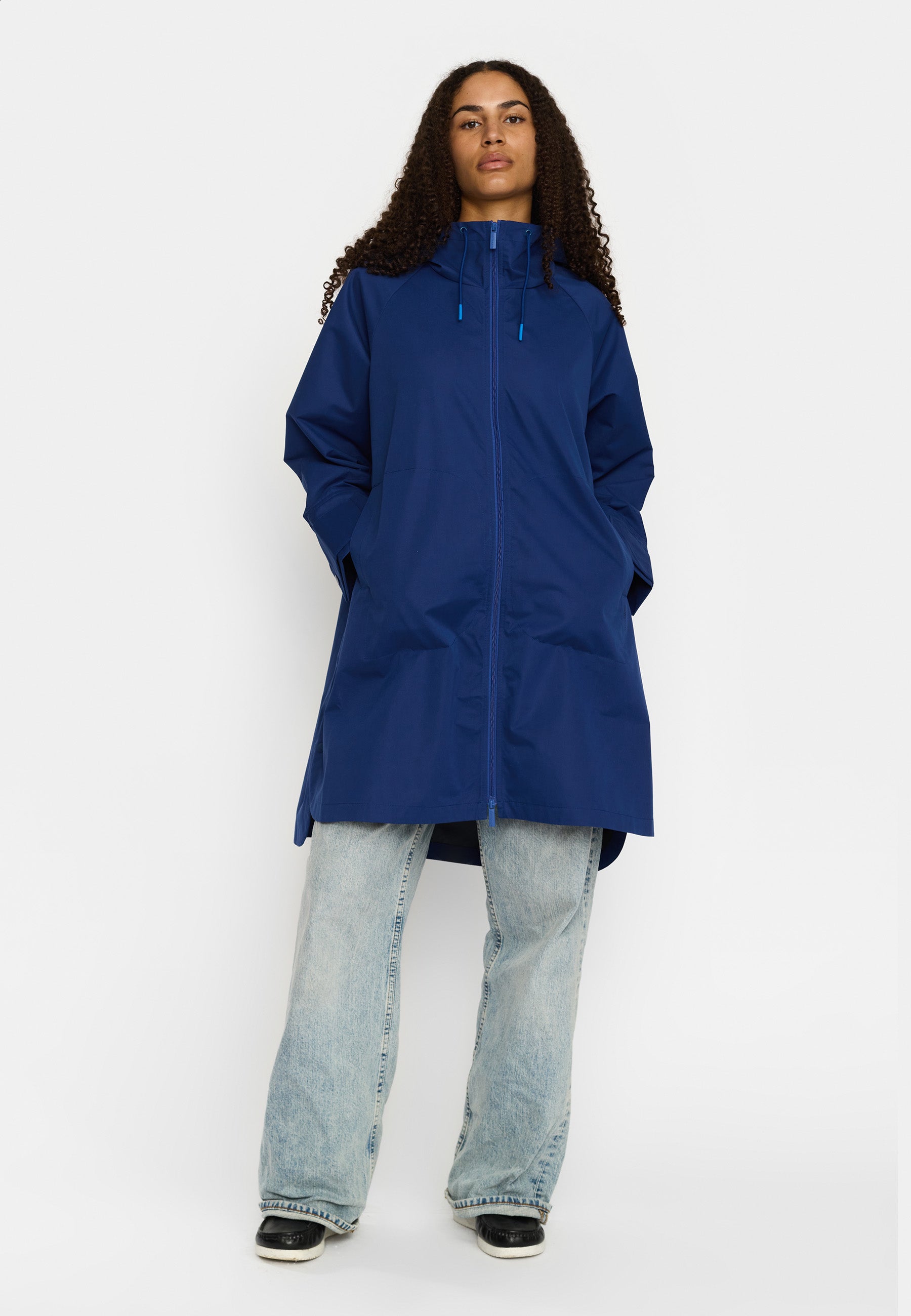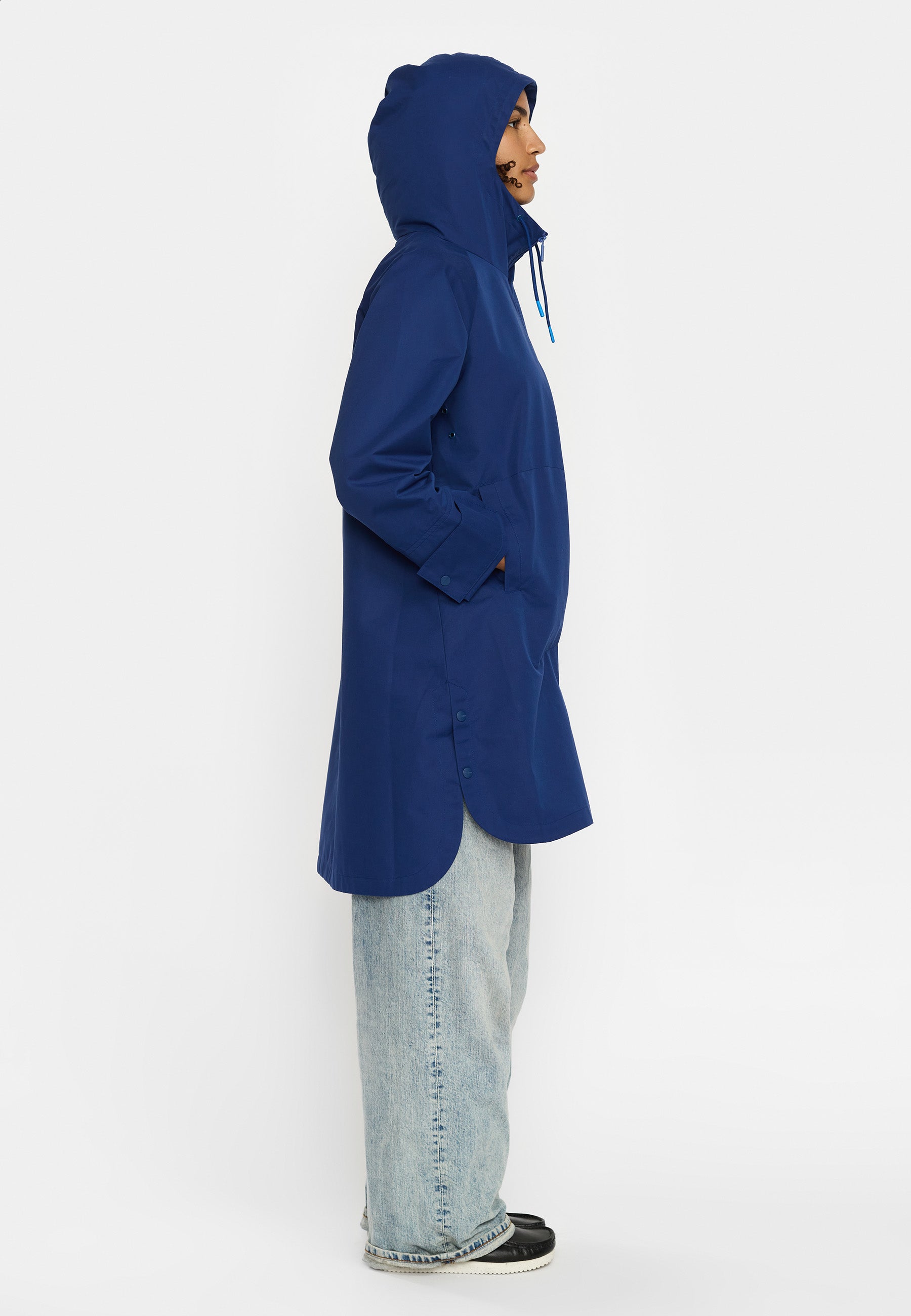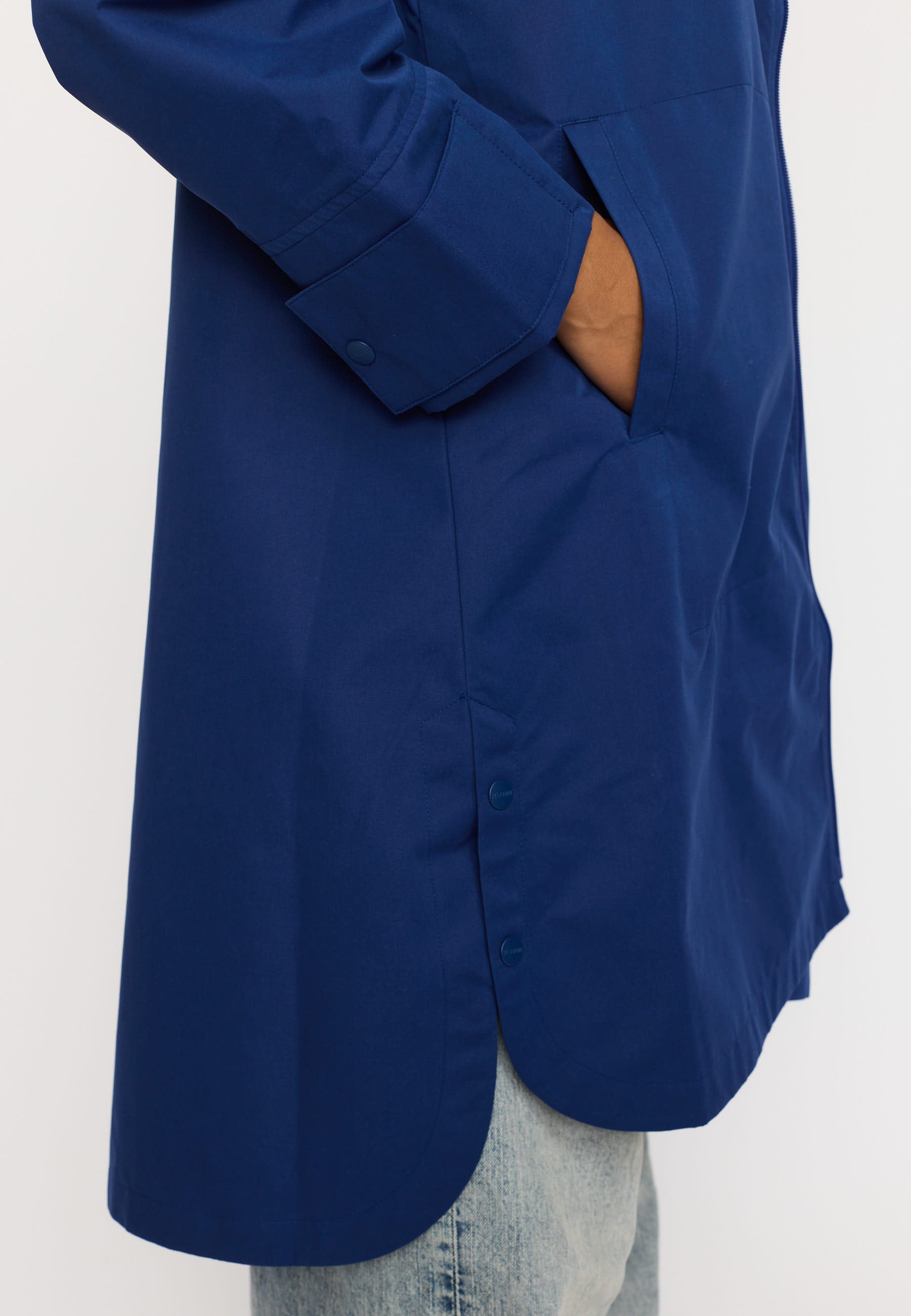 Knee-long hooded jacket made of a recycled polyester fabric with a soft, peached surface in a classic design. The coat has a feminine rounded bottom-line, half-moon shaped pockets, and an adjustable cuff and hood to keep out the wind and rain, and the tone in tone zipper and logo snap-buttons finishes the jacket nicely. The technical lightweight fabric with a 14.000 WCP membrane on the backside, is designed for versatile use, and makes this jacket a safe choice for the changing spring weather. To guarantee that this garment is free from any harmful fluorocarbon, it is coated with environmentally friendly and water-repellent Teflon EcoElite coating