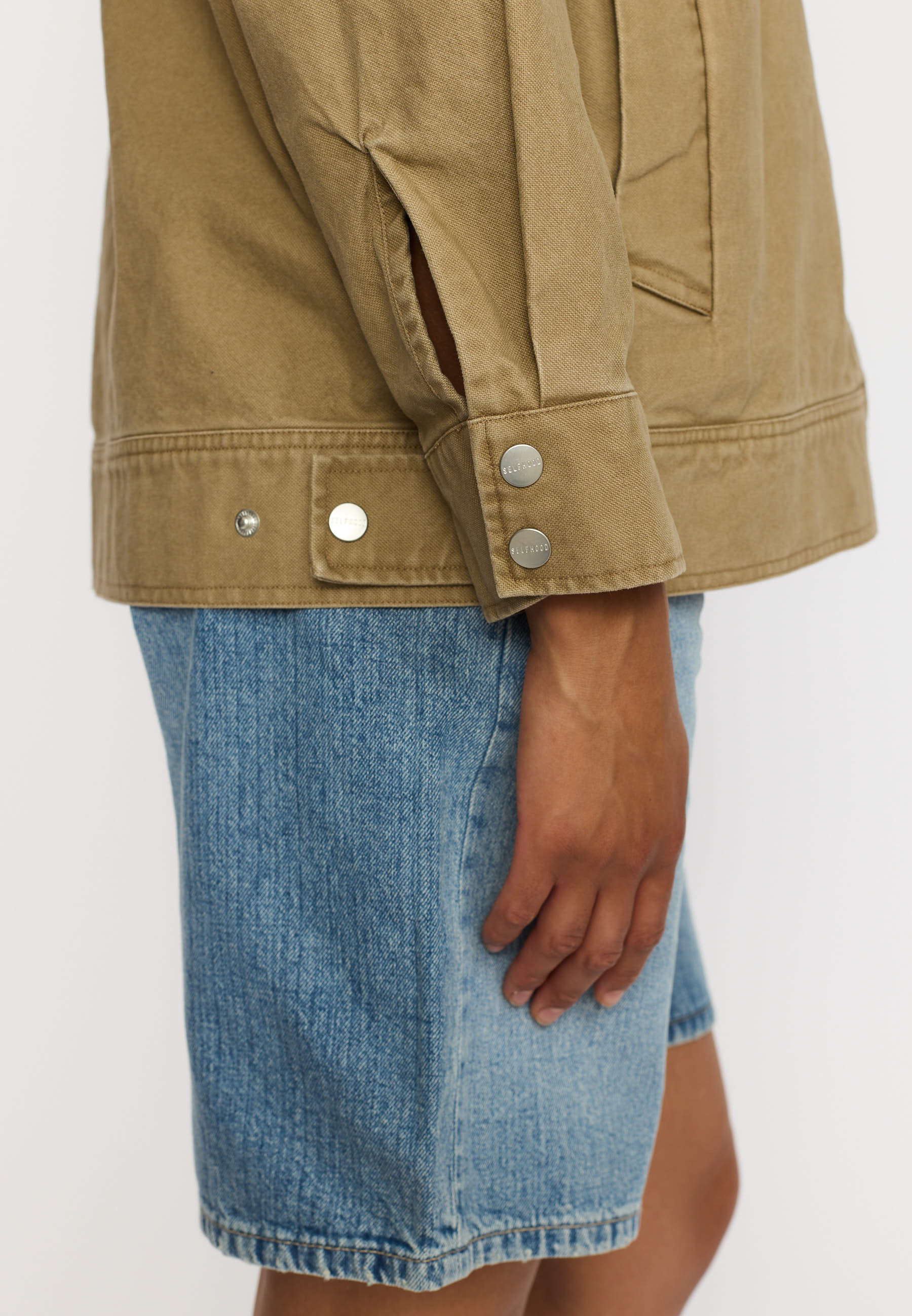 A classic workwear jacket in heavy cotton oxford fabric, with a contrast collar. The jacket is without lining, and it is designed with chunky angled welt pockets, and heavy double stitches for a casual look. The fit is slightly oversize with a low shoulder seam. The jacket has a metal snap-button-closure and a yoke at the front and back, buttoned cuffs and the hem can be adjusted with straps in the sides
