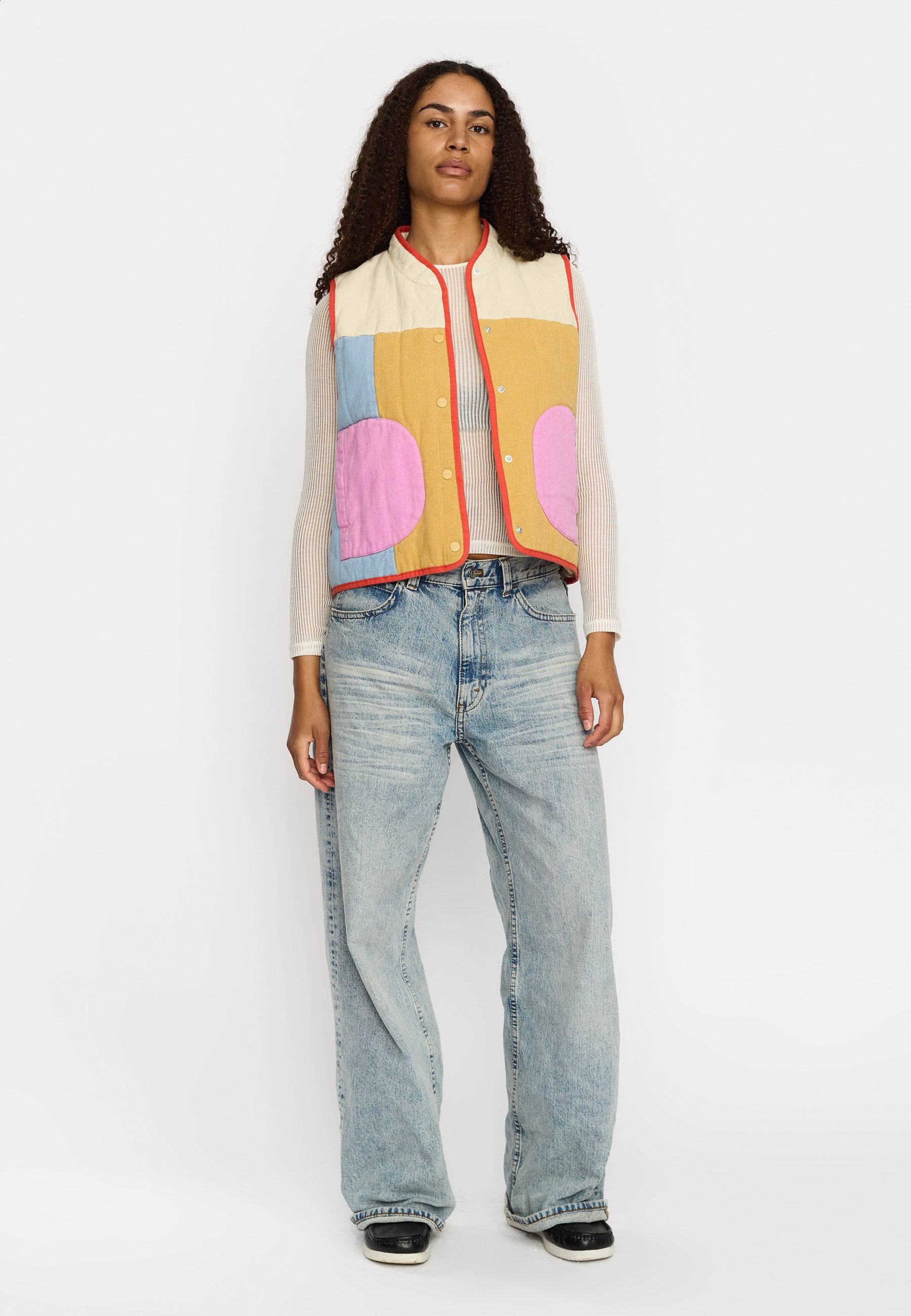 A multi-block-color quilted vest with a stand-up collar, made in a soft cotton twill fabric. The vertical quilt pattern adds resilience to the vest, and it has comfortable geometrical patch-pockets in contrast color. This vest is decorated with colorful cotton bindings, for a nice finish. Padded with 60 GSM Recycled Thinsulate™ insulation, which makes a sleek design without compromising on warmth. This padding is made of 78% recycled fiber, and it traps more air in less space and keeps you surprisingly warm on a chilly day